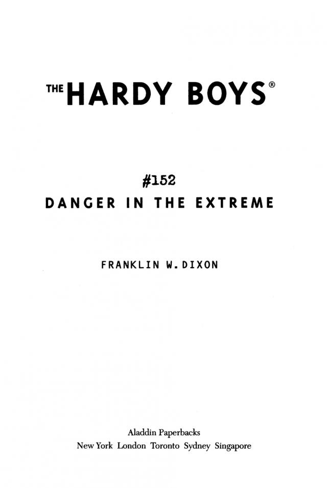 Quickly the reporter got the three friends’ names. She turned back to the camera and switched on her microphone. “I’m here in Bayport at the third annual Max Games, the Olympics of extreme sports,” she said. “This weekend star athletes from around the world will compete in events such as snowboard aerials, downhill mountain bike racing, and speed ice climbing. Danger is the name of the game here at the Max Games.”